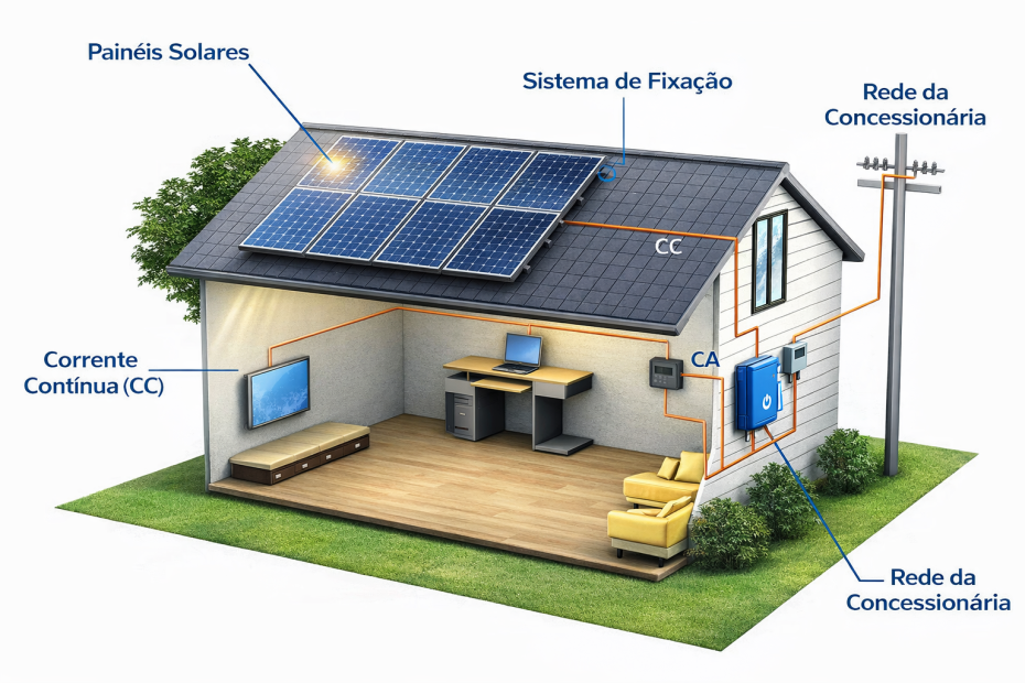 Equipamentos que convertem a energia gerada em corrente contínua (CC) para corrente alternada (CA), permitindo o uso nos equipamentos do imóvel.